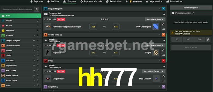 O hh777 oferece uma grande seleção de opções de apostas em e-sports com probabilidades competitivas